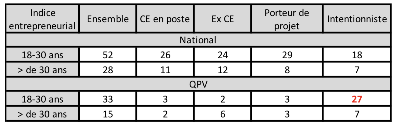 ♦ Au niveau national (60% vs 43) ; au niveau QPV (45% vs 22).♦ Au niveau national, les femmes appartiennent aux différents composants de l’indice entrepreneurial, avec toutefois davantage d’intentionnistes et de porteurs de projet (19 et 20%) que chez les chefs d’entreprise en poste ou chez les ex chefs d’entreprise (17 et 15%).