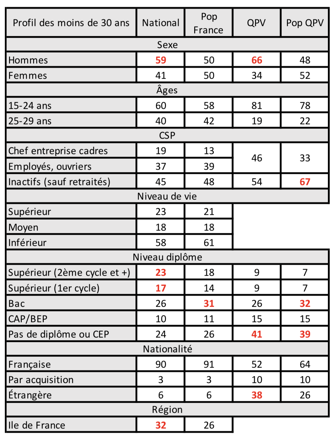 - QUARTIERS PRIORITAIRES DE LA POLITIQUE DE LA VILLE (QPV) : échantillon de 501 personnes, dont 127 habitants des QPV âgés de moins de 30 ans.