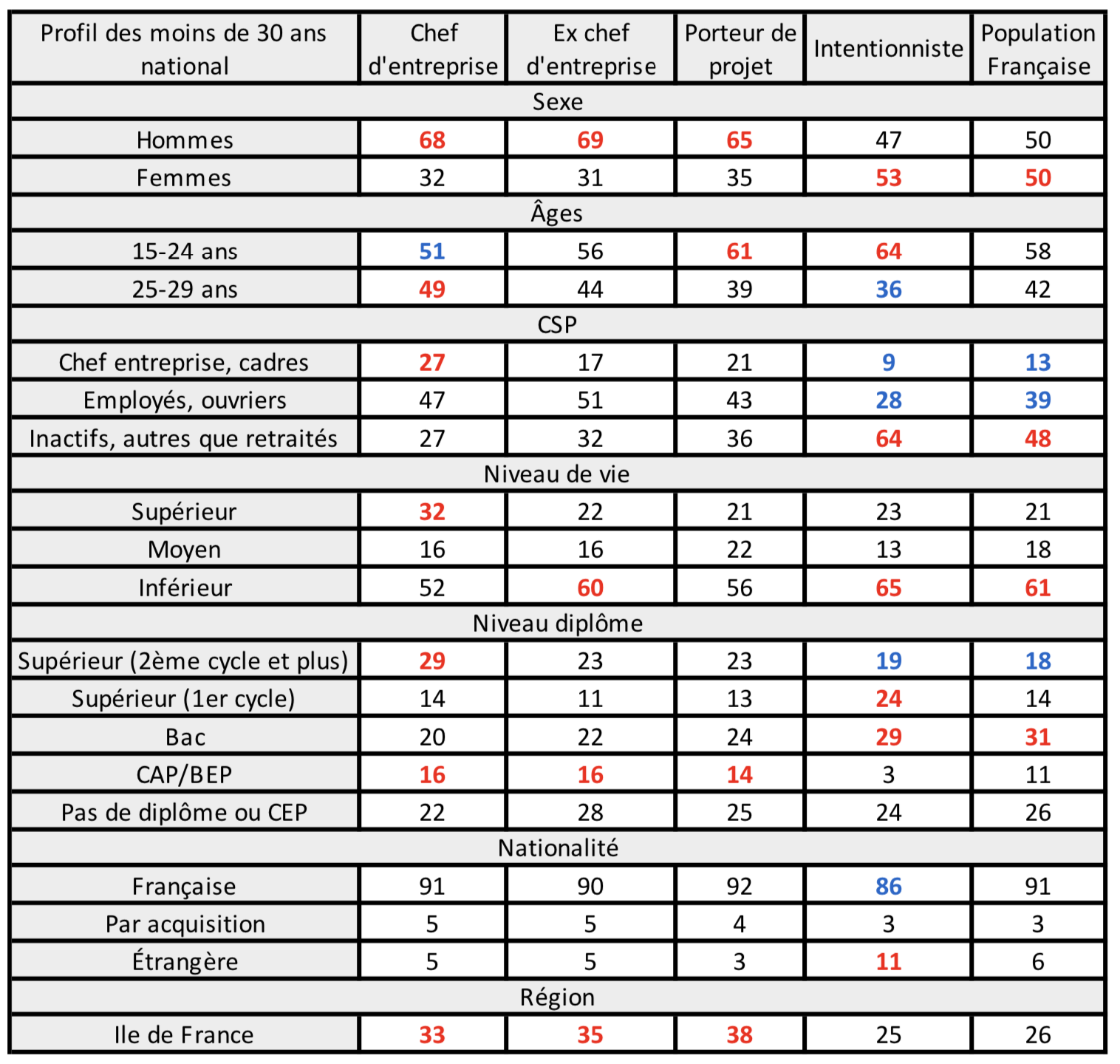 – Noter que l’Ile de France est davantage le lieu de prédilection des chefs d’entreprise (33-35%) vs 25 pour les intentionnistes et 26% pour la population globale.
