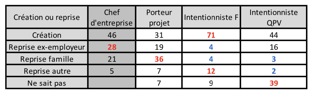♦ Création ou reprise ?La création reste toujours minoritaire (entre 31 et 46%), sauf pour les intentionnistes Français (71%) et la reprise à la famille importante pour les porteurs de projet (36%) et les entrepreneurs en poste (22) vs 4-3 chez les intentionnistes, tout comme la reprise à l’ex-employeur (16 à 28%) sauf chez les intentionnistes ; peu la reprise à d’autres chefs d’entreprise (5 à 12%).