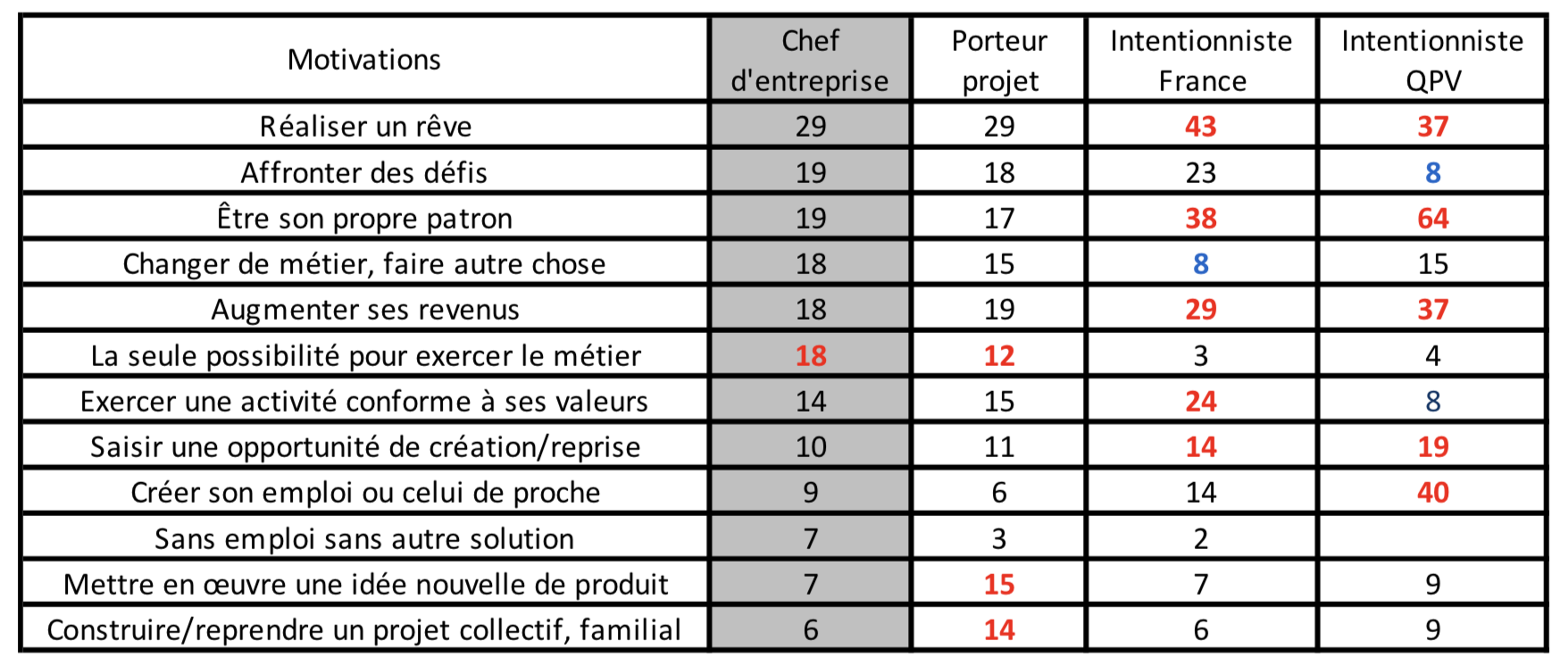 Devenir son propre patron, est bien plus important chez les intentionnistes (38% notamment pour ceux en QPV 64%), que chez les chefs d’entreprise en poste ou chez les porteurs de projet (19 et 17%) ; idem pour l’item “réaliser un rêve” chez les intentionnistes (37 ou 43%) vs 29 dans les 2 autres catégories ; idem aussi pour “augmenter ses revenus” (29 et 37% vs 18-19).