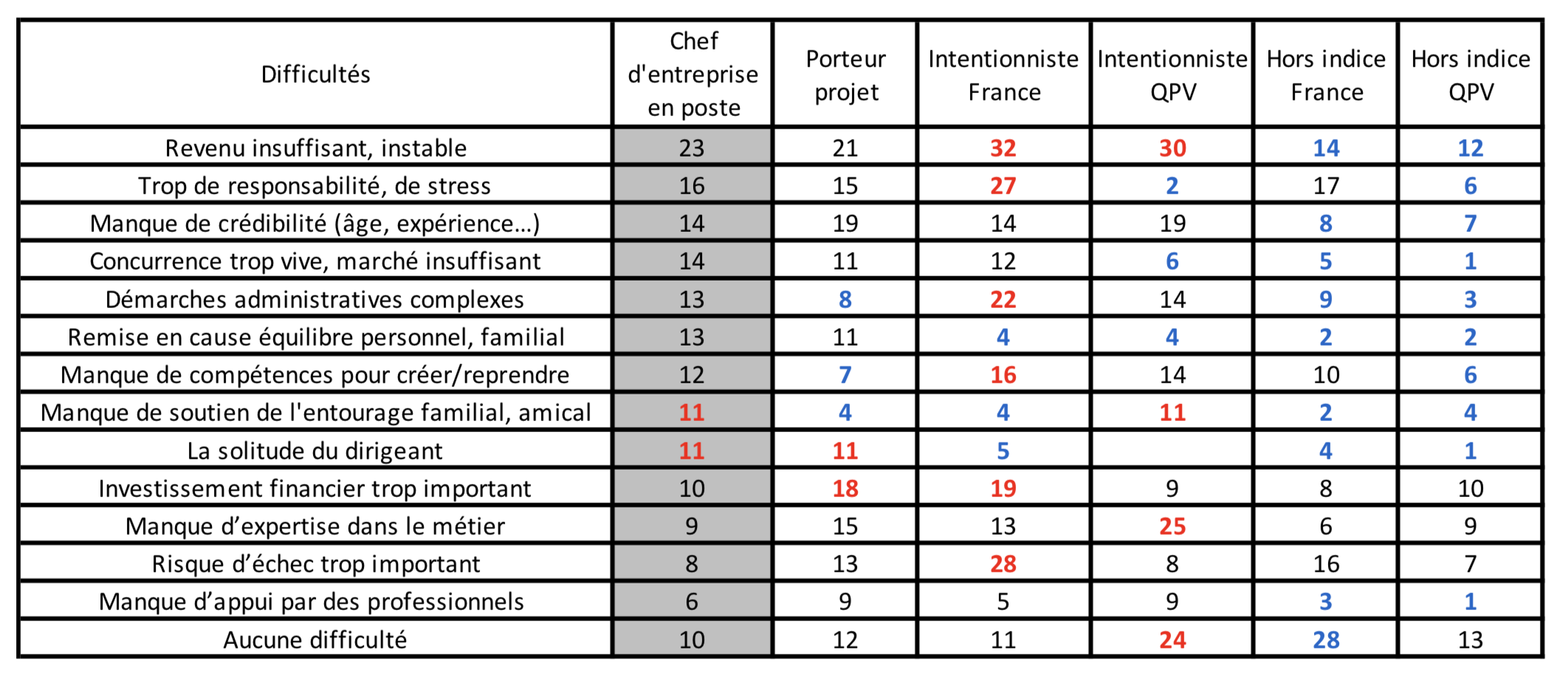 Noter chez ceux des QPV une certaine naïveté ou le fait de penser “qu’on y arrivera toujours” alors qu’ils sont plutôt en retrait sur les questions du stress, de la concurrence, de l’investissement financier trop lourd, le risque d’échec et le fort pourcentage de l’item “aucune difficulté” (24% vs 10-12% pour les autres).