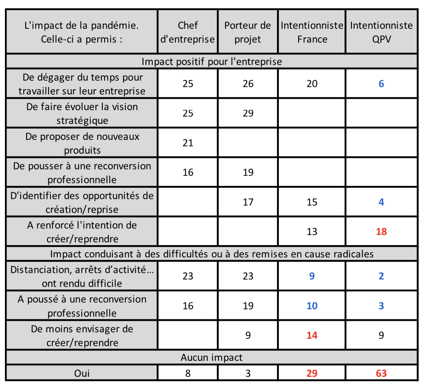 L’impact sur le projet de création est plus faible chez les intentionnistes (29% aucun impact), notamment ceux des QPV (63%) vs 3 et 8% pour les chefs d’entreprise et les porteurs de projets.