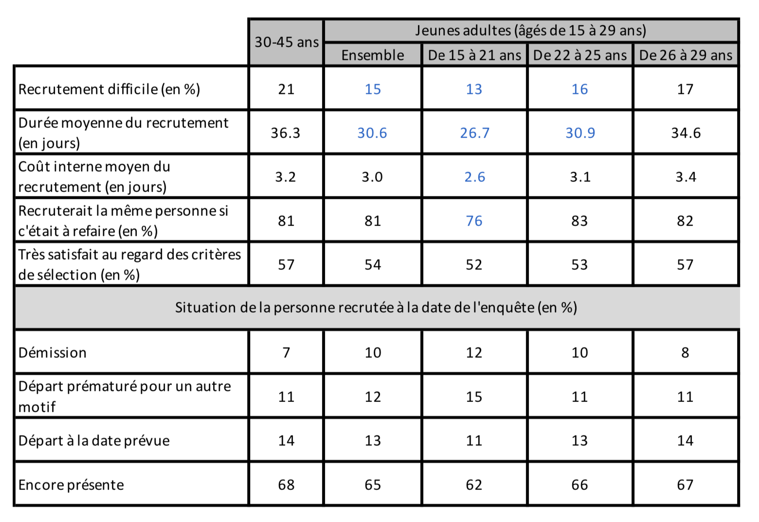 Le recrutement des jeunes est jugé plus facile que celui de leurs ainés ; ils recruteraient la même personne si c’était à refaire et sont plutôt satisfaits des critères de sélection employés.