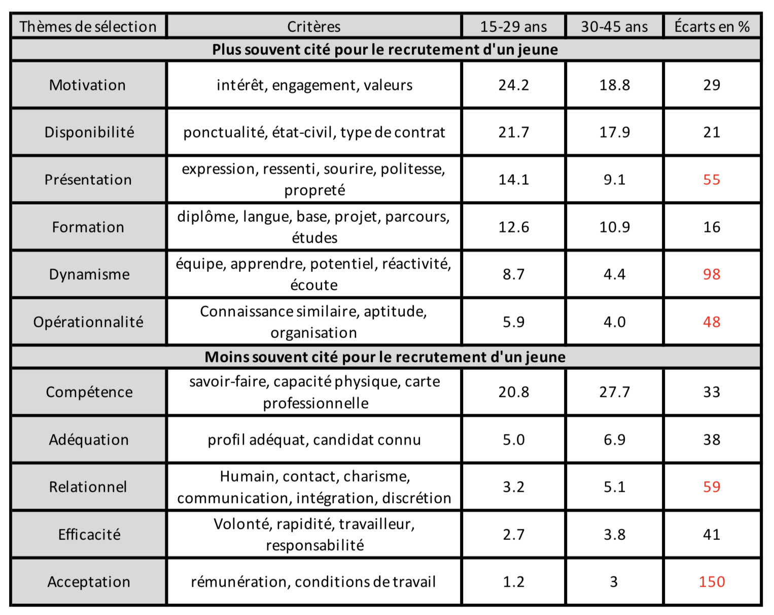 Les critères de sélection retenus par les recruteurs diffèrent selon l’âge du candidat embauché et peuvent être regroupés en 11 thèmes : 6 sont plus souvent associés au recrutement d’un junior et 5 à celui d’un confirmé, défini ici comme âgé de 30 à 45 ans.
