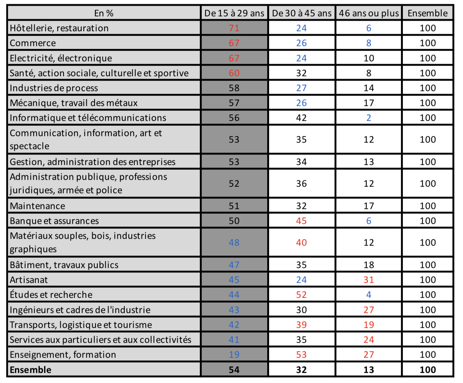 qui fournit aussi quelques données aussi sur les types d’entreprise où ils sont recrutés : en fait globalement les mêmes taille d’entreprise, les mêmes types d’entreprise (les 15-21 ans seraient un peu plus présents dans des grandes entreprises) ; les 26-29 ans sont plus présents dans des établissements de l’agglomération Parisienne, contrairement aux plus jeunes.