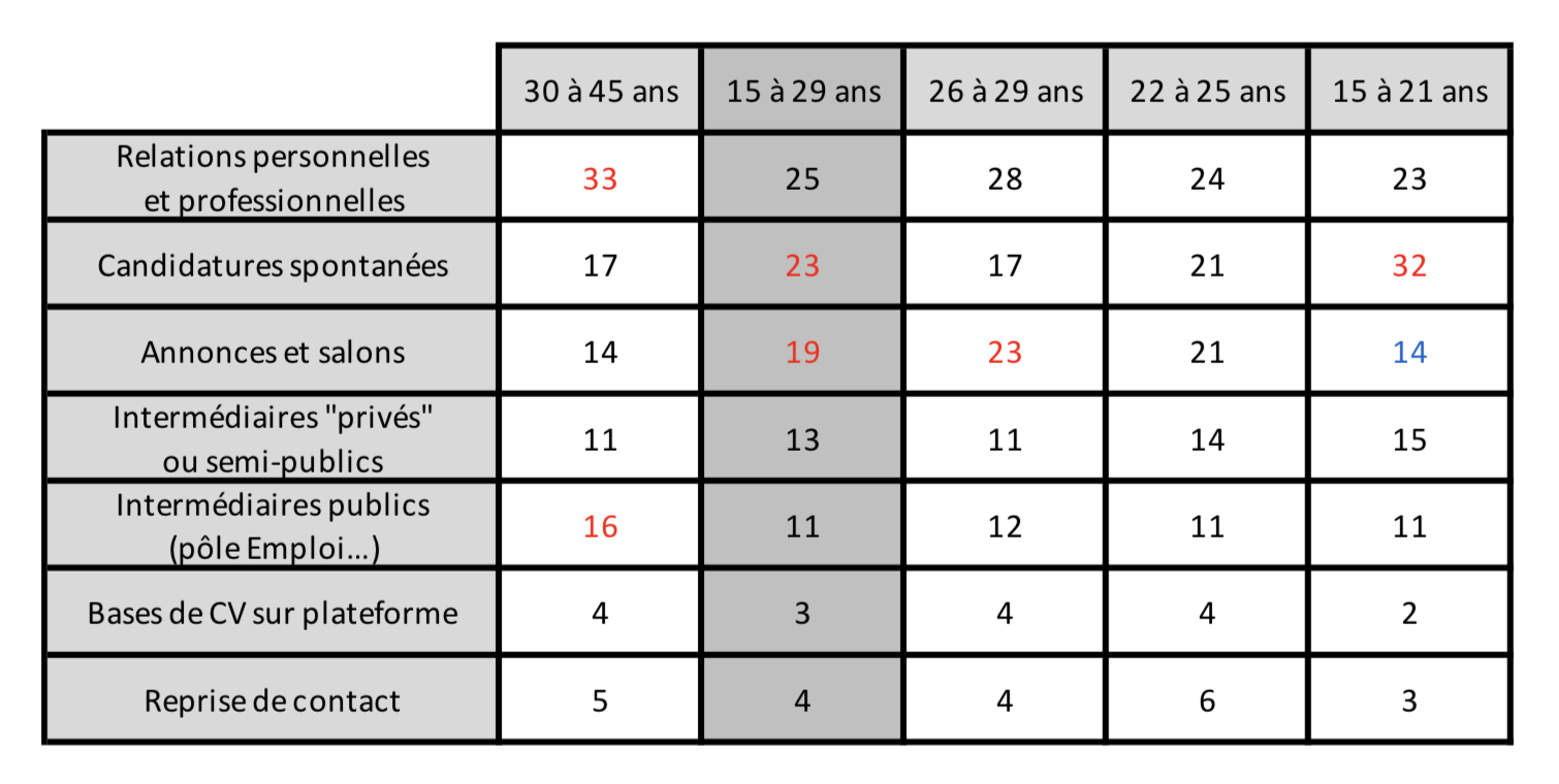 Quant aux canaux ayant conduit à l’embauche, les candidatures spontanées, les annonces et salons, les intermédiaires (les écoles, universités ou centres de formation), autres que le service public de l’emploi, permettent plus souvent le recrutement d’un junior que d’un candidat confirmé. A contrario, les employeurs trouvent moins souvent le candidat retenu grâce à leurs relations.Inversement, les cabinets de recrutement et agences d’intérim gèrent plus souvent les embauches de leurs aînés.