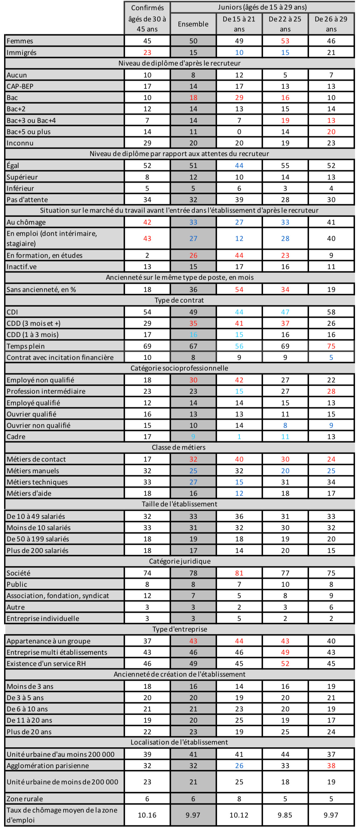 Méthodologie : L’enquête Ofer 2016 menée par la Dares en 2016 est la seule à décrire précisément au niveau national les différentes étapes du recrutement. Son champ couvre l’ensemble des établissements d’au moins un salarié du secteur concurrentiel non agricole ayant eu au moins un jour d’activité en 2015 en France métropolitaine ou dans les Drom et ayant recruté un « nouveau » salarié en CDI ou en CDD de plus d’un mois entre le 1er septembre et le 30 novembre 2015. Les salariés sont « nouveaux » dans la mesure où leur éventuelle embauche précédente dans l’établissement doit remonter à au moins 2 ans et leur départ de l’établissement à au moins 6 mois. Le champ de cette étude est restreint aux recrutements des personnes âgées de 15 à 45 ans et exclut l’alternance (contrat de professionnalisation et apprentissage), afin de rendre les populations des juniors et des confirmés plus comparables, soit 6 595 recrutements.