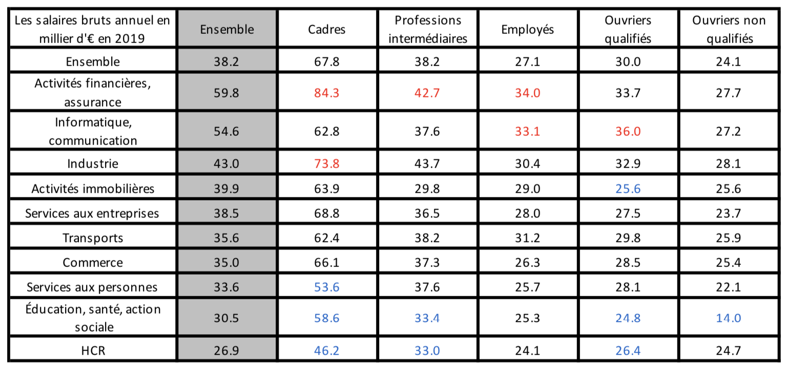 Les salaires varient selon le secteur d’activité, y compris au sein des CSP : le salaire moyen des cadres peut par exemple varier entre 46 200€ bruts annuels et 84 300€ (1,8 fois plus) ; les écarts sont plus modestes pour les autres CSP, entre 33 000 et 42 700€ pour les professions intermédiaires (1,3 fois plus), entre 24 100 et 34 000€ pour les employés et les ouvriers qualifiés (1,4 fois).Les secteurs où les salaires moyens sont les plus élevés sont localisés dans les activités financières et l’informatique/communication (59 800 et 54 600€), alors qu’ils sont bien plus modestes pour les HCR, l’éducation, la santé et les services aux personnes où les cadres sont bien moins nombreux.