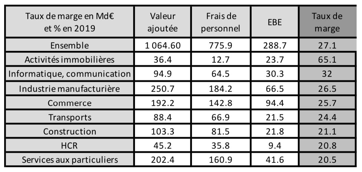 Dans le partage de la valeur ajoutée, le taux de marge rend compte de ce qui reste à disposition des entreprises – l’excédent brut d’exploitation (EBE) –, notamment pour rémunérer le capital et investir, une fois déduites les rémunérations salariales.En 2019, le taux de marge varie entre 20,8% (pour l’hébergement restauration) et 32% (pour l’information et la communication), sauf dans les activités immobilières (65,1%).