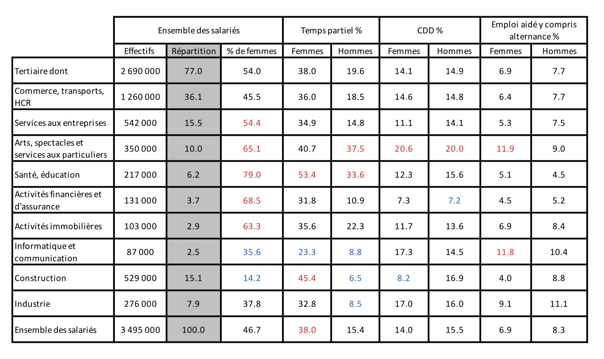 Au 31 décembre 2020, les femmes représentent 46,7% des salariés (47,3% en 2019). Elles sont très majoritaires dans le secteur de l’enseignement, de la santé, les activités financières et assurance (68,5%), immobilières (63,3%), les services aux particuliers et les activités récréative (65,1%).Dans le tertiaire, les entreprises comptant un seul salarié sont particulièrement implantées dans les activités immobilières, ainsi que dans l’enseignement, la santé.