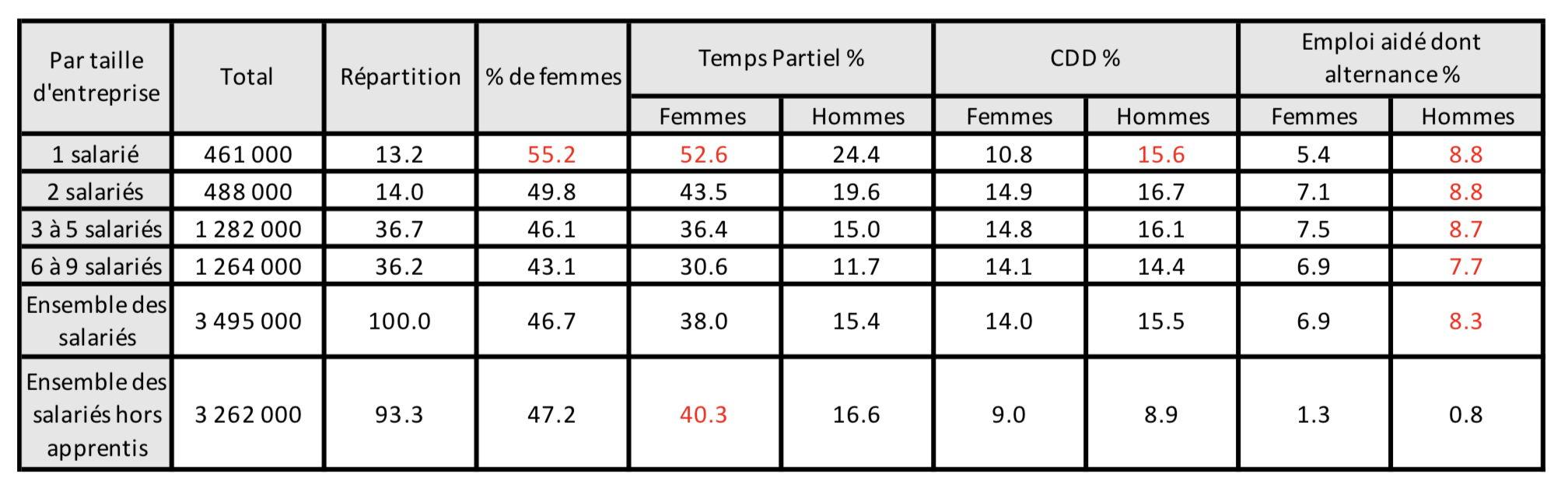 En termes de taille d’entreprise, les femmes sont 55% des salariés dans les TPE avec 1 salarié, 50% dans celles de 2 salariés, 46% dans les 3-5 salariés et 43% dans les 6-9 salariés ; c’est davantage le fait des activités de services.