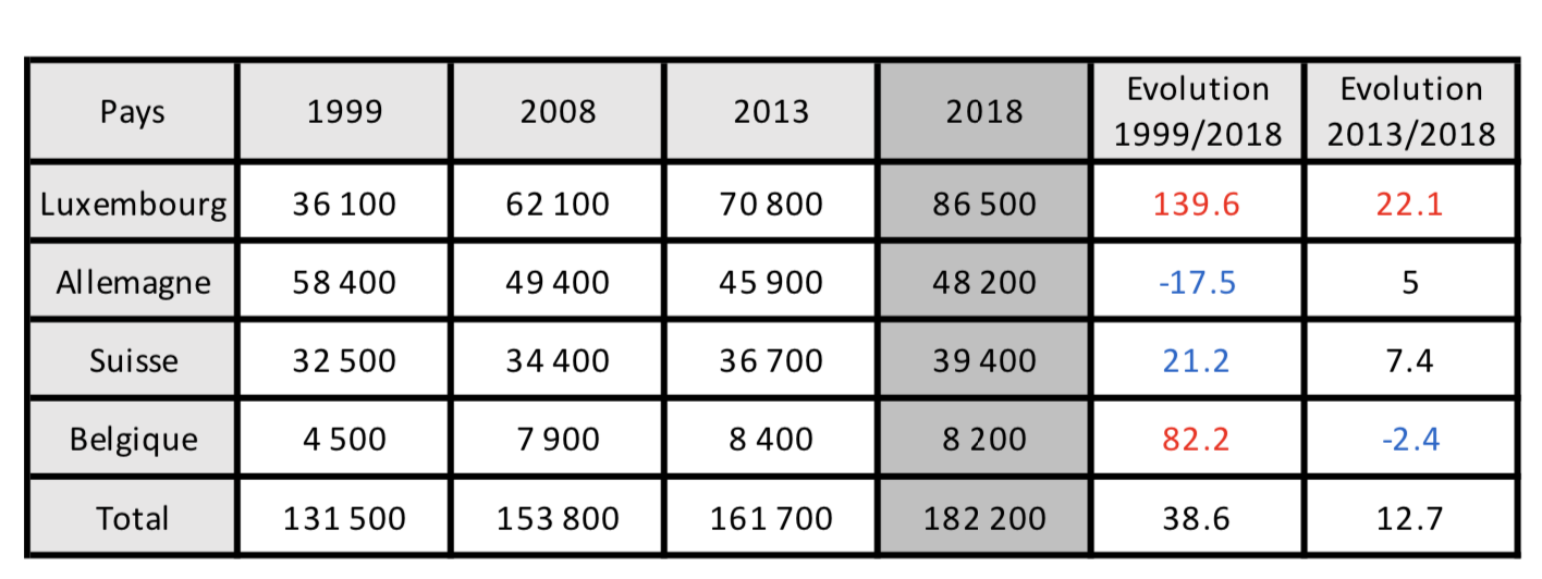 Pour en savoir davantage : Le travail frontalier dans le Grand Est : en 2018, 182 000 habitants de la région travaillent dans un pays voisin – Insee Analyses Grand Est – 144