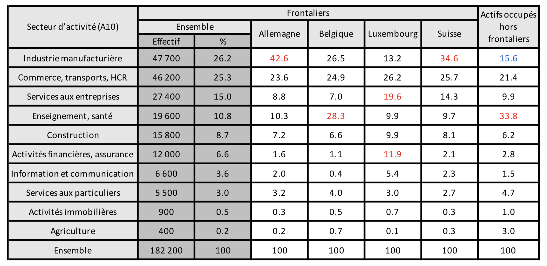 Le poids de l’industrie est particulièrement fort en Allemagne et en Suisse (43% et 35%), mais concerne différents types de productions : côté allemand, il s’agit notamment de l’industrie automobile et côté suisse, de l’industrie pharmaceutique. Au Luxembourg, plus de 10 000 frontaliers travaillent dans les activités financières et d’assurance (12% des actifs venant du Grand Est).