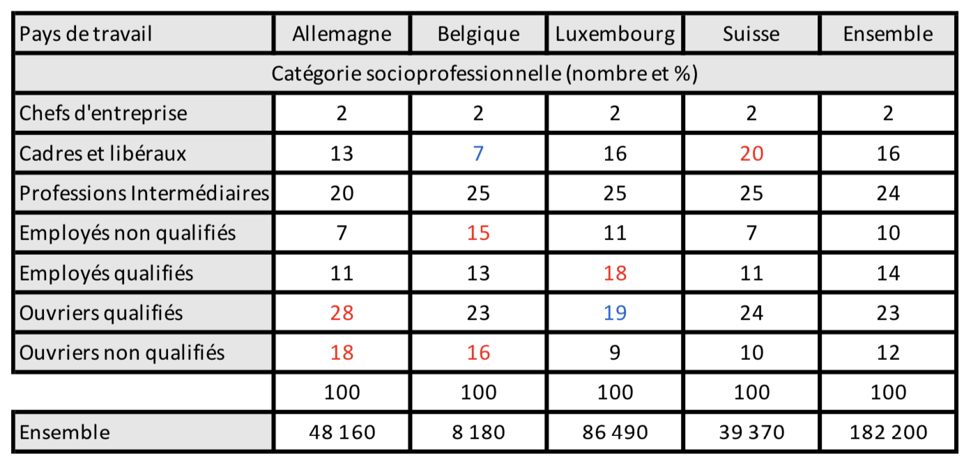 ♦ Depuis 2008, les ouvriers sont toutefois de moins en moins nombreux, en particulier les ouvriers non qualifiés, les processus de production industriels étant de plus en plus automatisés, alors que le nombre d’employés non qualifiés est en hausse.Les professions intermédiaires couvrent un quart des effectifs ; les cadres ne représentent que 6% des frontaliers travaillant en Belgique, tandis qu’au Luxembourg et en Suisse, cette part atteint respectivement 16 et 20%.