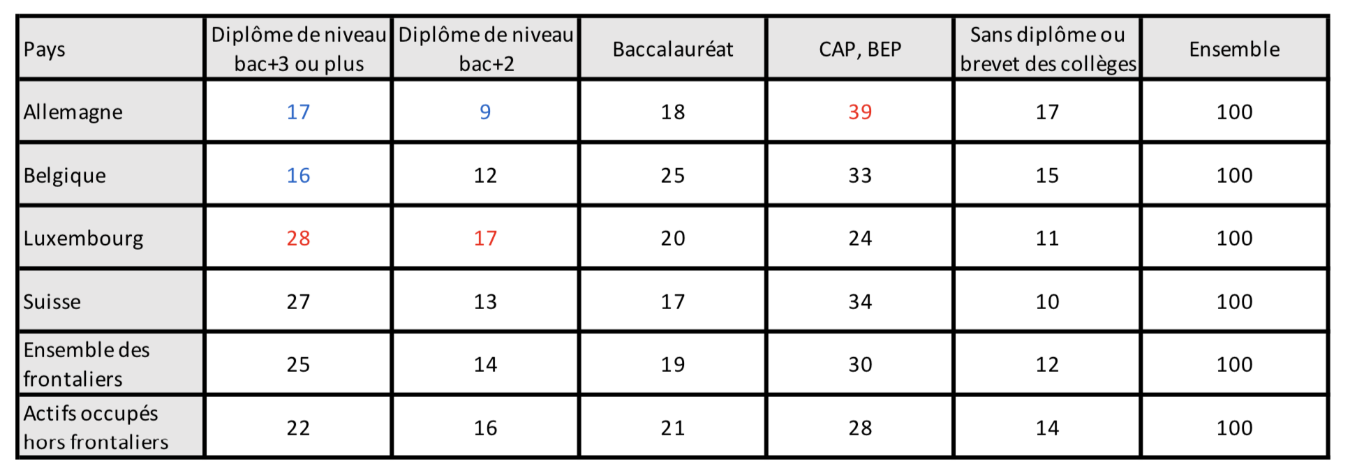 ♦ Leur niveau de diplôme est proche des actifs occupés de la région ; toutefois, l’Allemagne fait le plus appel au niveau CAP, voire en-deçà (56% vs 42 en moyenne), alors que le Luxembourg est le pays qui sollicite le plus de diplômés de bac +3 et au-delà (45% vs 38)