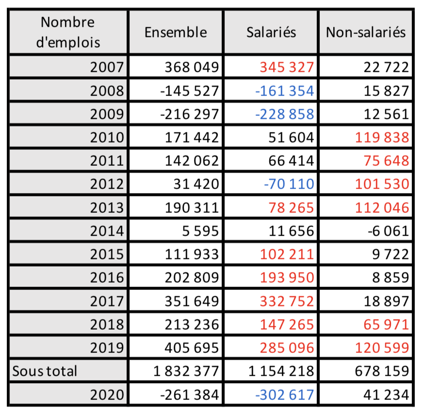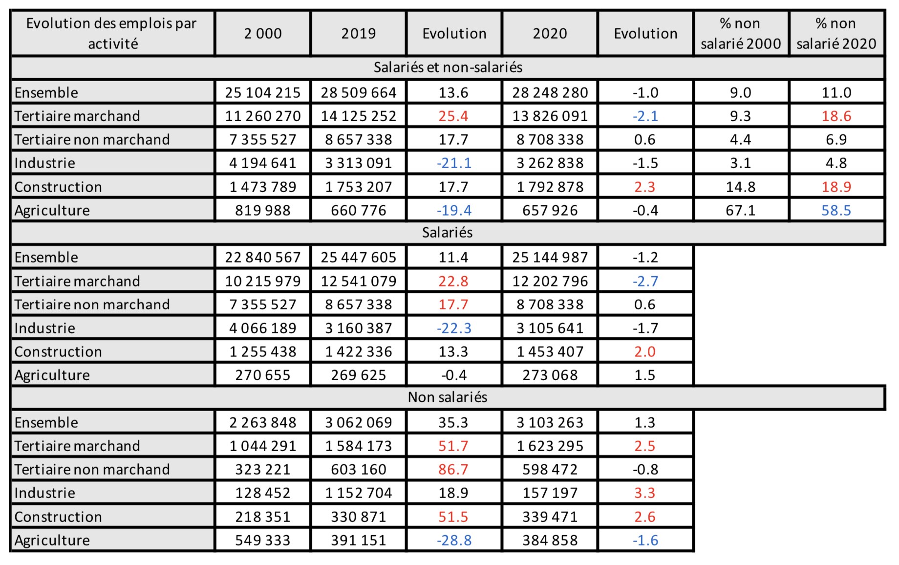 Fin 2020, 28,2 millions de personnes occupent un emploi en France hors Mayotte. L’emploi a diminué de 261 000 en 2020 par rapport à fin 2019 (0,9%).Noter que le nombre des salariés entre 2000 et 2019 a beaucoup progressé dans les années 2015-2019, et régressaient en 2008-2009 et en 2020, alors que les non-salariés progressaient entre 2010 et 2013, et entre 2018 et 2020.