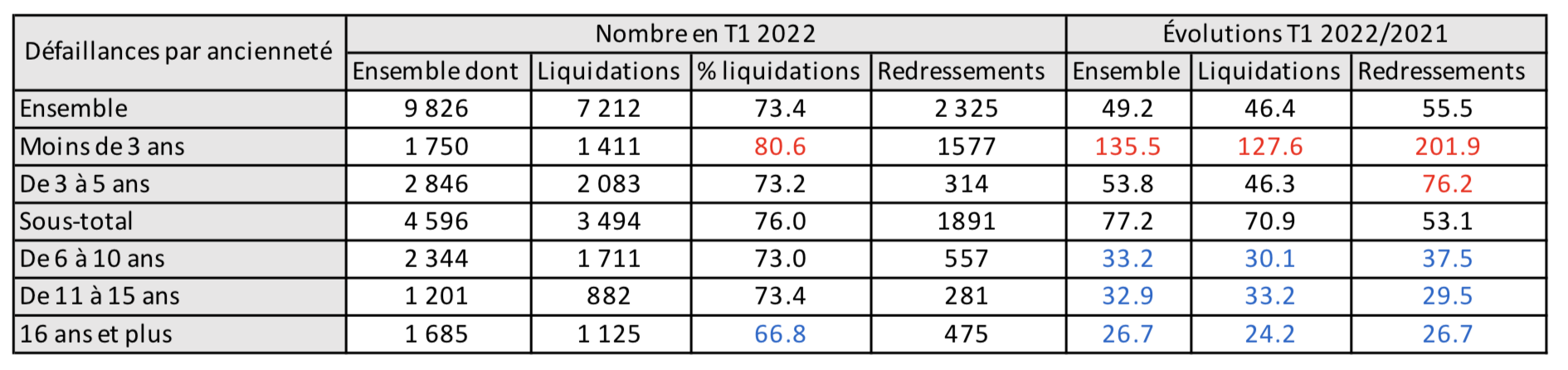 Les entreprises les plus jeunes (les moins de 3 ans d’ancienneté) ont connu les plus fortes hausses (+135%), que ce soit pour les liquidations directes (+128%) et plus encore les redressements (+202%), alors que les 6 ans et plus font état de hausses bien plus modérées (entre 24 et 37% pour des hausses moyennes situées entre 46 et 55%).
