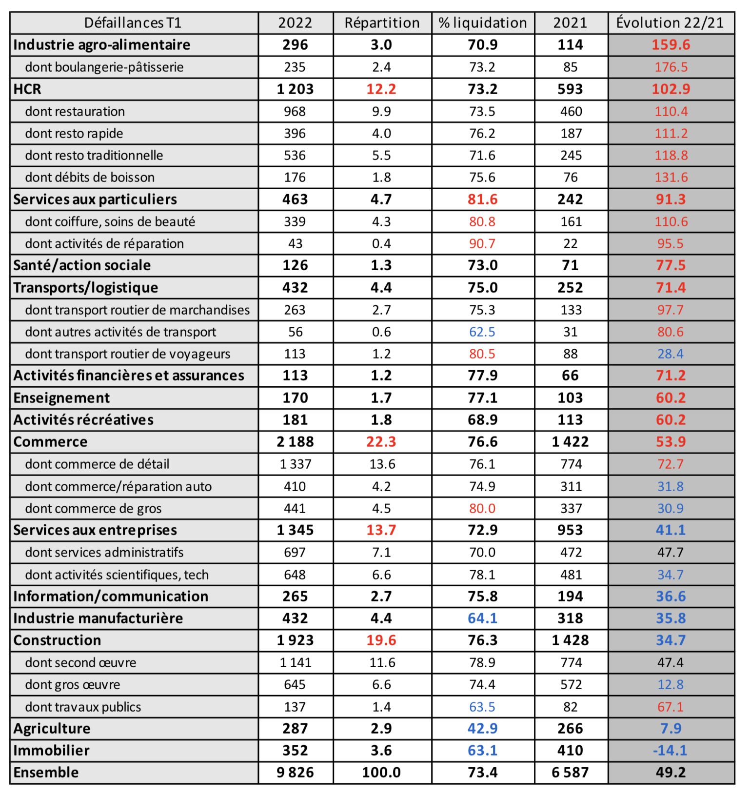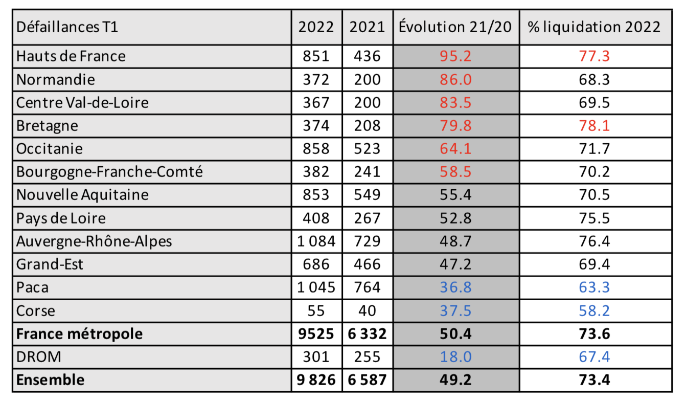 Les défaillances sont en hausse de 41% entre 2021 et 2022, mais en baisse de 25% au regard de 2019. Le 1er trimestre était dans une situation un peu plus favorable.