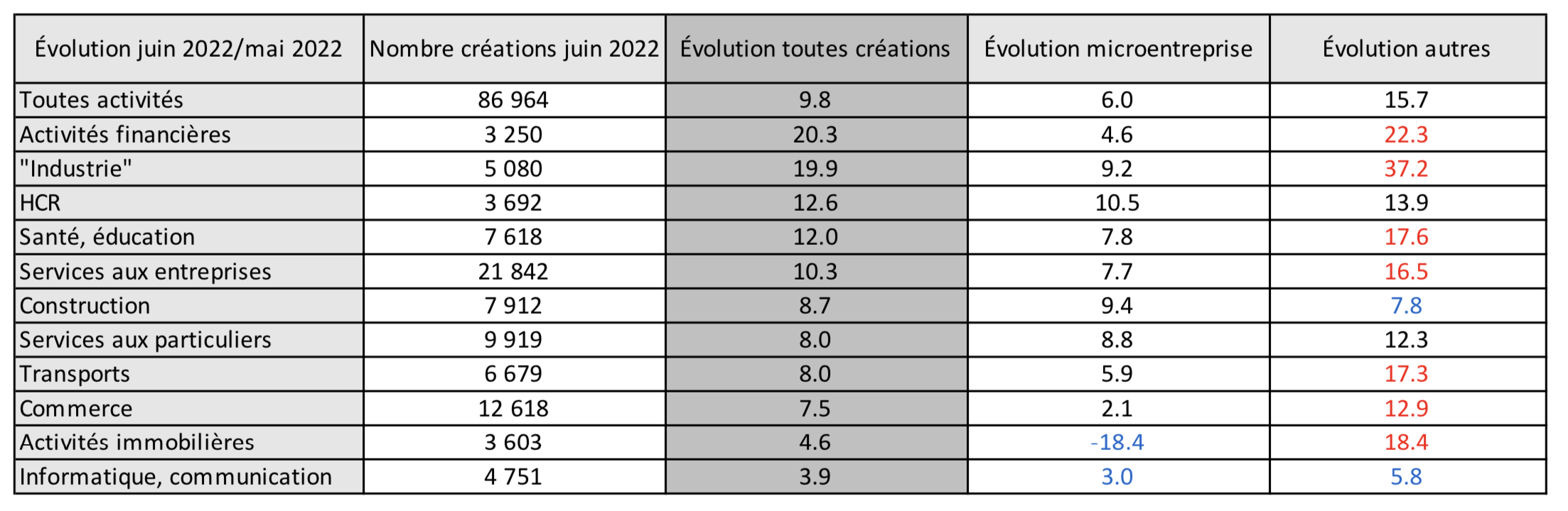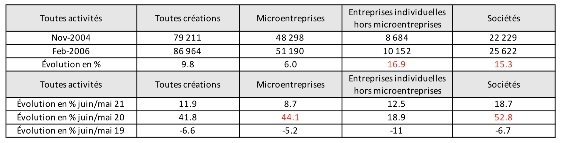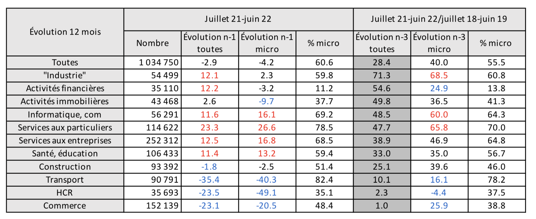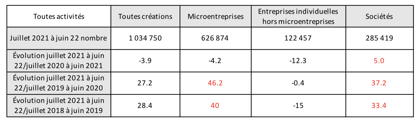 Globalement, en juillet 2021-juin 2022, comparé à juillet 2020-juin 2021, la baisse est de 3,9% (-4% pour les microentreprises, mais +5% pour les sociétés).Si nous comparons juillet 2021-juin 2022 à juillet 2018-juin 2019 (période hors Covid), la progression du nombre de création est de 28% (dont 40% pour les microentreprises et 33% pour les sociétés) ; celle des entreprises individuelles hors micro est en chute de 15%, une situation normale du fait de la montée en puissance de la microentreprise.