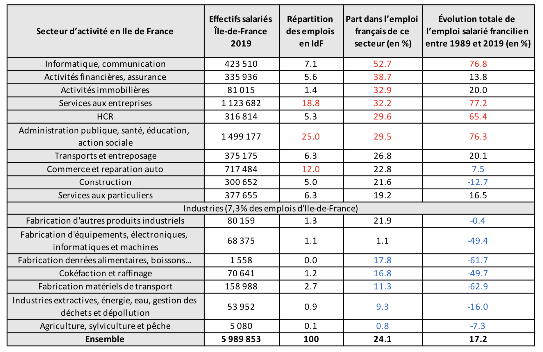 L’Île-de-France regroupe 6 millions de salariés et 24% des emplois salariés français, soit deux fois plus qu’en Auvergne-Rhône-Alpes, deuxième région française en nombre d’emplois. Cependant, toutes les activités ne sont pas représentées de la même façon au sein de la région. 9 salariés sur 10 en Île-de-France travaillent ainsi dans le secteur tertiaire.⇒ Le poids très important du tertiaire en Ile-de-France