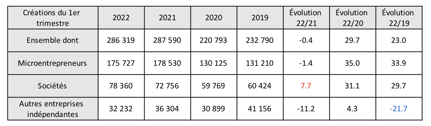 Par contre, comparé au 1er trimestre 2019 (avant le Covid), la progression est notoire (+23% dont +33,9 pour les microentrepreneurs et +29,7% pour les sociétés). Le poids des microentrepreneurs s’est accru passant de 56,4 à 61,4%, alors que celui des sociétés est stable (26 vs 27%).