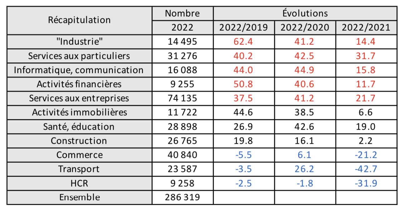 Il s’agit de l’observation la plus significative quant à l’évolution du nombre de création, l’analyse des 2 autres périodes (2022/2020 et 2022/2021) étant beaucoup plus liée à la crise sanitaire.