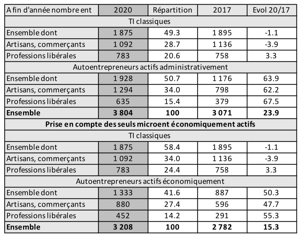 Oublions ces décalages pour nous attacher à situer le poids respectif des entreprises classiques et des autoentrepreneurs.♦ A la fin 2020, les entreprises classiques en activité chiffrent 1,875 million d’entreprises dont 58% d’artisans-commerçants et 42% de libéraux et les autoentrepreneurs économiquement actifs 1,333 million dont 66% d’artisans-commerçants et 34% de libéraux. Les entreprises classiques sont ainsi 58% des indépendants actifs économiquement (en termes administratifs ils ne seraient que 49%.