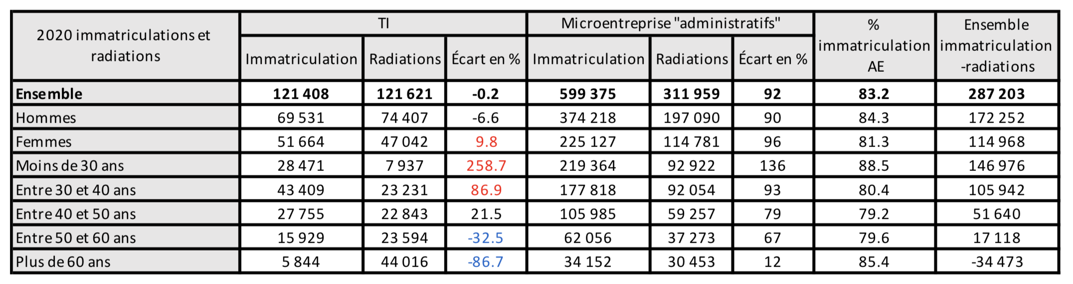 ♦ Les immatriculations et radiation en 2020, montrent, en ce qui concerne les entreprises classiques, une grande proximité (121 408 immatriculations vs 121 621 radiations). Cette situation est fort différente pour les autoentrepreneurs où les immatriculations l’emportent largement sur les radiations (mais on ne connait pas le poids des sans activité économique de part et d’autre, d’autant que la grande majorité des radiations provient de ceux qui n’ont jamais fait de recettes).