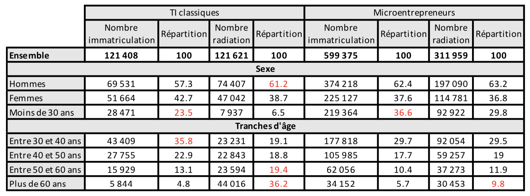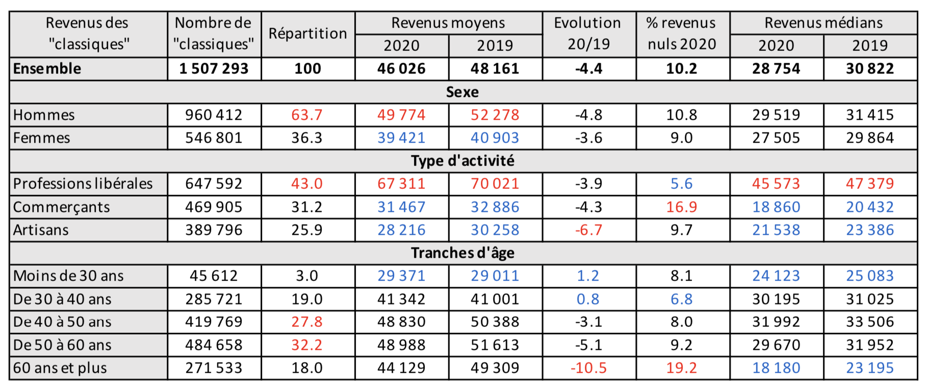 Cette baisse a été plus prononcée chez les hommes (-4,8%), majoritaires (63,7%). Le groupe professionnel le plus touché par la baisse du revenu moyen est l’artisanat avec une baisse de 6,7%, alors que celui des professions libérales diminue de 3,9%. Les moins de 40 ans sont les seuls à avoir vu leur revenu moyen augmenter (autour de 1%), alors que les 60 ans et plus ont vu leur revenu baisser de plus de 10%.