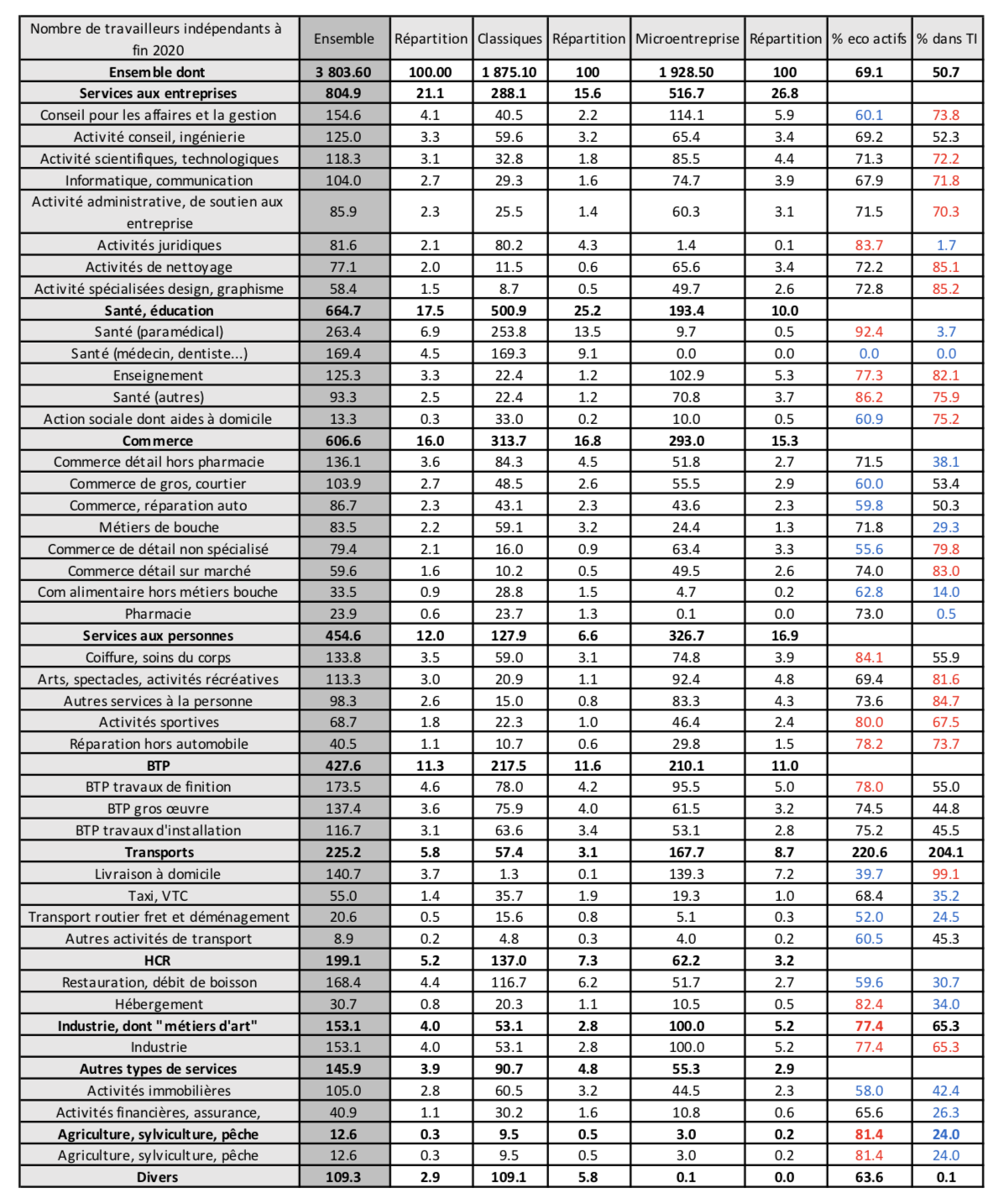 Une différence de décompte entre l’Insee et l’Urssaf, et au sein même de l’Urssaf : fin 2019, l’Insee recense 3,5 millions de personnes exerçant une activité non salariée générant un revenu dont 432 000 exploitants agricoles (3,1 millions hors agricole), alors que l’ACOSS compte 3,516 millions de comptes de travailleurs indépendants inscrits en fin d’année, dont 3,1 millions génèrent un revenu dans cet article.Fin 2020, 16,7% des indépendants cumulent leur activité avec un emploi dans le secteur privé (22,3% des AE contre 7,1% pour les classiques).