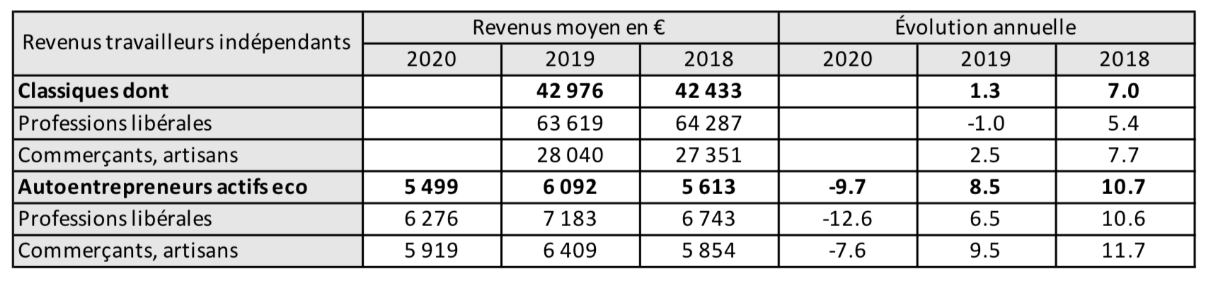♦ Les données Insee et Urssaf sont assez proches, du moins pour les “classiques” : les revenus annuels moyens des “classiques” en 2018 chiffrent 42 433€ contre 45 800€ pour l’Insee, celui des autoentrepreneurs est, toujours en 2018, 5 613€ pour l’Urssaf vs 6 492€ pour l’Insee.Les professions libérales au sein des classiques ont des revenus bien supérieurs à ceux des artisans-commerçants (2,27 fois plus), une différence estompée chez les autoentrepreneurs (1,15 fois plus).