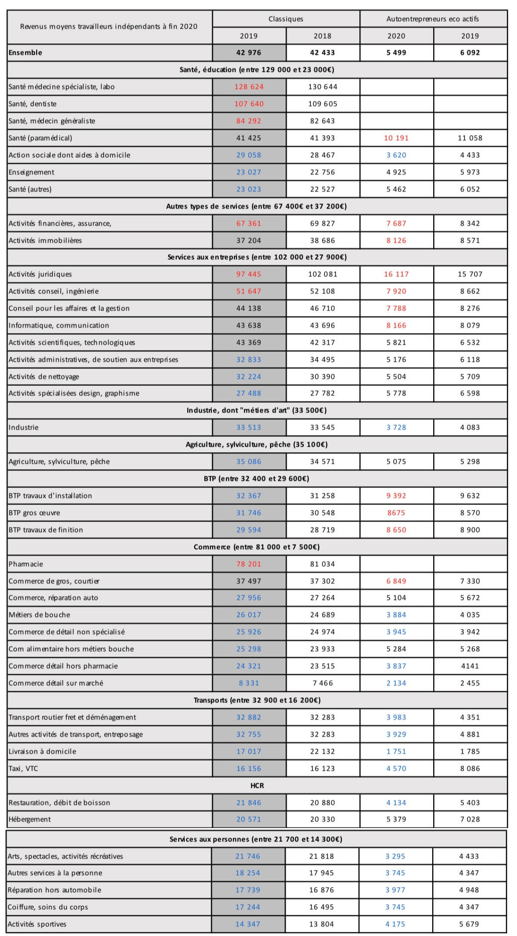 Les “classiques” ont enregistré une baisse de leur revenu moyen de plus de 8%. Noter qu’il augmente dans le commerce de détail alimentaire hors métiers de bouches (+8,3%), les métiers de bouche (+5%) et le secteur des activités financières et d’assurance (+2,6%).