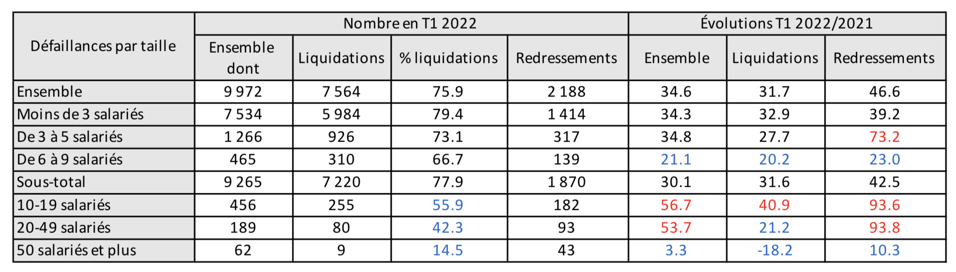 Les moins de 10 salariés constituent toujours l’essentiel des défaillances (93%), notamment les moins de 3 salariés (76%) ; si les moins de 3 salariés sont 95% des liquidations, ils sont moins présents dans les redressements (85%).En termes d’évolution entre 2021 et 2022, ce sont les 10 à 49 salariés qui ont le plus progressé (+56% environ), même s’ils ne sont que 6,5% des défaillances ; alors que les moins de 10 salariés n’ont progressé que de 30% (et même 21% les 6-9 salariés).