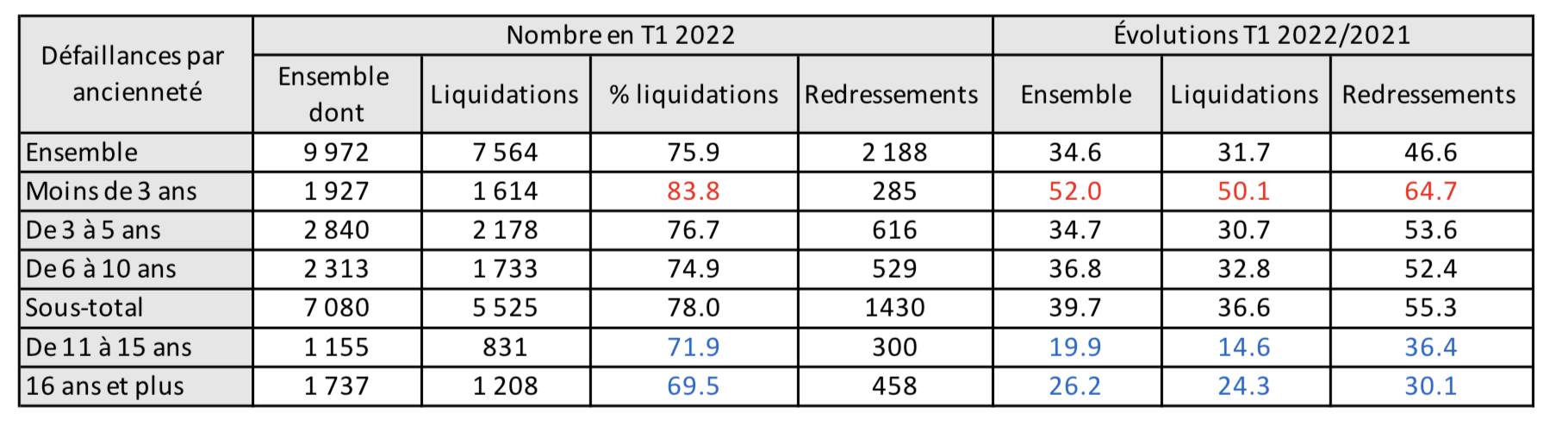 Pourtant les moins de 3 ans ne sont que 19% à avoir connu des défaillances, contre 52% les 3 à 10 ans ; par ailleurs, les 16 ans et plus ne comptent que 17% des défaillances.Mais les moins de 3 ans sont ceux qui ont le plus progressé en défaillance entre 2021 et 2022 (+50% pour les liquidations et même +65% pour les redressements).