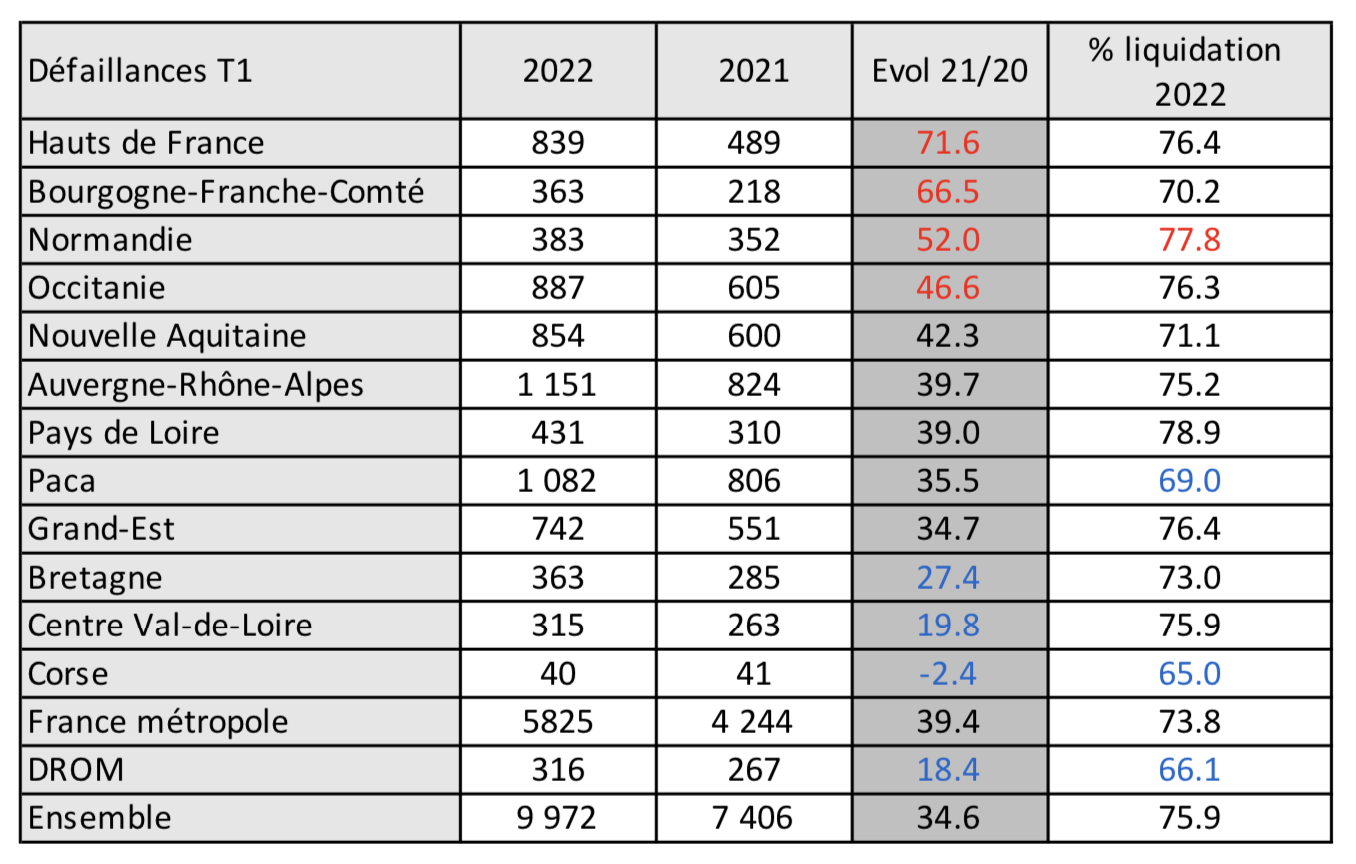 ⇒ 4 régions ont connu de fortes hausses de défaillances entre 2021 et 2022