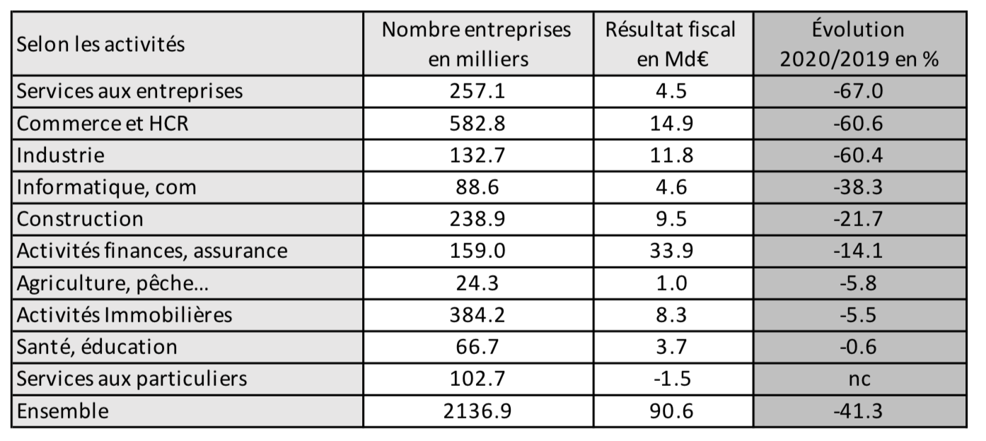 5,9 millions d’entreprises (dont les microentrepreneurs imposables et les entreprises du secteur agricole/pêche, compris) ont dégagé un résultat fiscal de 163Md€, en baisse de 30% au regard de 2019 (232Md€), et de 13% au regard de la moyenne 2016-2018.2,137 millions d’entreprises sont au régime de l’impôt société (dont 90% de TPE), et 3,7 millions à l’impôt revenu (dont 1,7 million au réel et 2 millions en tant que microentrepreneurs).