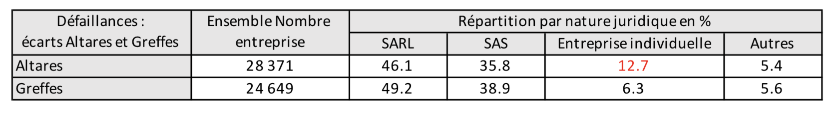 Les fichiers des Greffes comptabilisent 24 649 défaillances vs 28 371 pour Altares, qui ne prend pas en compte les jugements rendus par les Tribunaux d’Instance. L’écart provient essentiellement des entreprises individuelles (12,7% des défaillances chez Altares et 6,3 pour les Greffes).