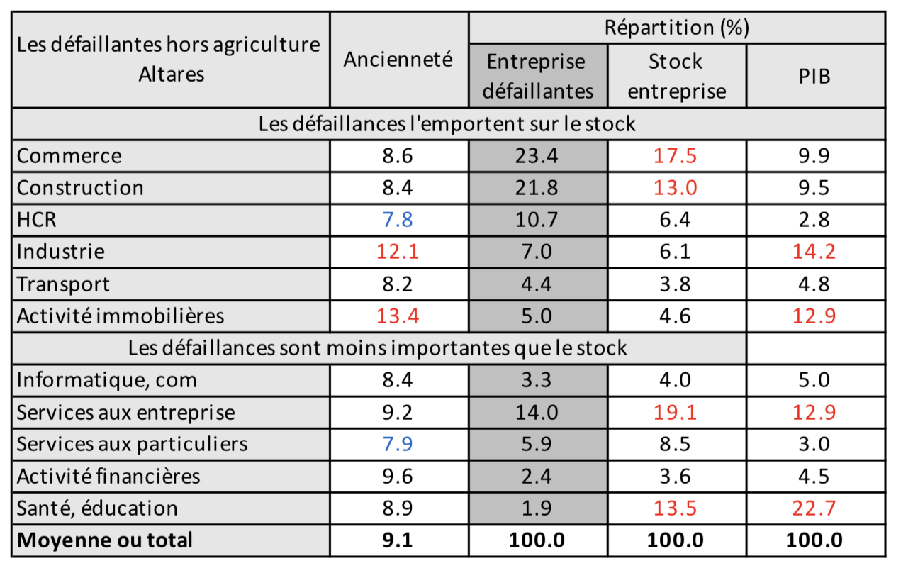 Certaines activités sont en % plus défaillantes que la répartition du stock ; ce sont les activités les plus sensibles à la défaillance ; on y trouve surtout le commerce, les HCR et le BTP, alors que d’autres sont en-deçà, notamment les services aux entreprises, la santé/éducation.