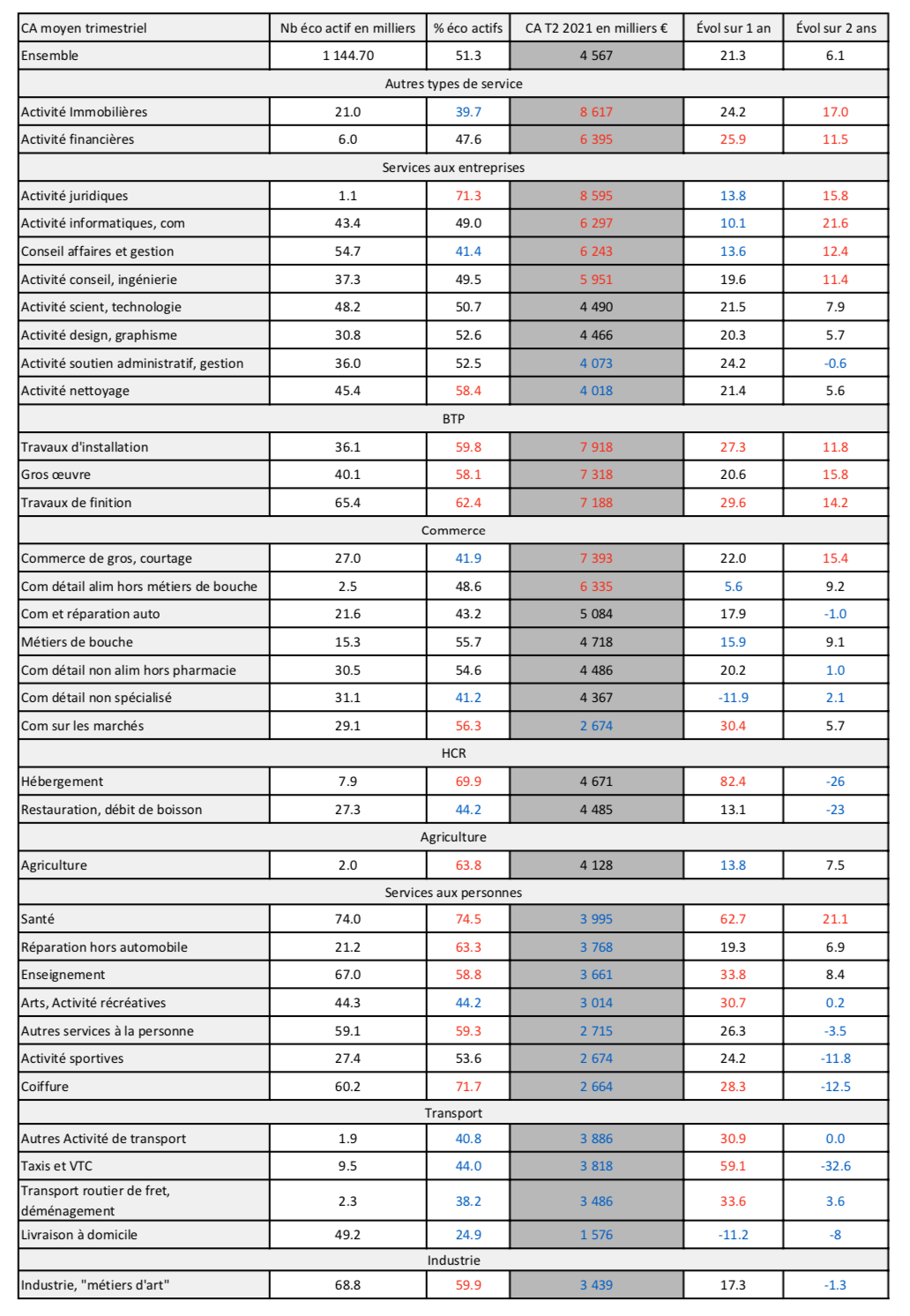 ♦ Les chiffres d’affaires moyens du 2éme trimestre 2021 connaissent des écarts importants, s’étalant de 1 576€ pour les livraisons à domicile à 8 617€ pour les activités immobilières. Le secteur des services (aux entreprises, notamment activités juridiques, informatique, conseil pour les affaires et la gestion, les activités immobilières et financières) et le BTP s’opposent aux services aux personnes et aux activités de transport, beaucoup moins rémunérateurs.