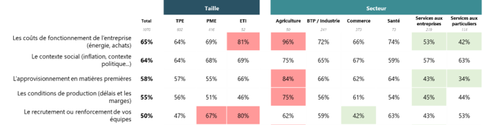Concernant les sujets de préoccupation des dirigeants, ils sont 65 % à avoir évoqué l’augmentation des coûts de fonctionnement de l’entreprise, 64 % ont eux évoqué le contexte social et enfin 58 % les difficultés d’approvisionnement.Un autre sujet devient de plus en plus sensible à savoir le recrutement. Effectivement, 50 % des dirigeants l’ont évoqué dans leur réponse et ce dernier est en hausse de 8 points par rapport à 2021. Par ailleurs, ce sujet concerne particulièrement les ETI qui sont 80 % à évoquer cet enjeu.