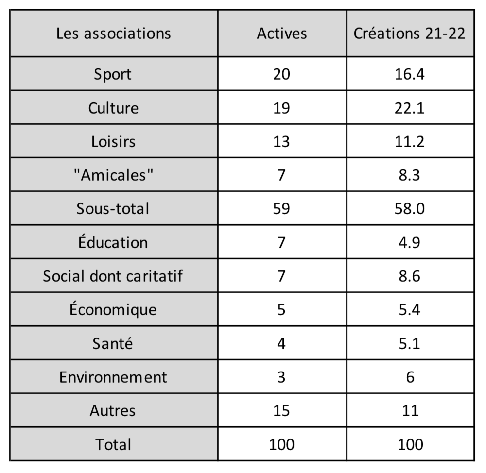 Entre 1 400 000 et 1 500 000 associations sont actives ; 66 487 ont été créées en un an (2021-2022) vs 72 000 en moyenne entre 2014 et 2019 et 66 630 entre 2010 et 2013.♦ 58 % des créations d’association concernent l’animation, qu’elle soit culturelle (22,1 %), sportive (15,4 %), ou encore de loisirs sous les thèmes « clubs de loisirs » et « action socioculturelle » (8,1 % et 3,1 %). On peut ajouter diverses associations répertoriées sous le thème « amicales, groupements affinitaires, d’entraide » (8,3 %) où l’on trouve notamment les organisations de professions, les amicales de personnes originaires d’un même pays ou d’une même région, les associations féminines…