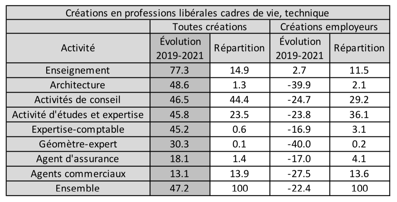 ♦ Dans le secteur cadre de vie et technique, le nombre de création a progressé de 47 % entre 2019 et 2021. Ces activités recouvrent des activités majoritairement non‐réglementées et pour lesquelles les procédures de création d’entreprise sont des plus simples et immédiates.Les activités d’enseignement augmentent le plus (+ 77,3 %), avec la réforme de la formation professionnelle, la formation à distance imposée par la crise, et l’enseignement de “loisir” (méditation, peinture…) ; croissance aussi des créations dans les activités de conseil (+ 46,5 %) et d’études et expertise (+ 45,8 %), à l’origine de 67,9 % des créations de ce secteur ; 68 % sont réalisées sous le statut juridique d’entreprise individuelle qui englobe celui de la microentreprise, dont le rôle est primordial (68,5 % des créations de ce secteur, 86 % pour l’activité d’enseignement).