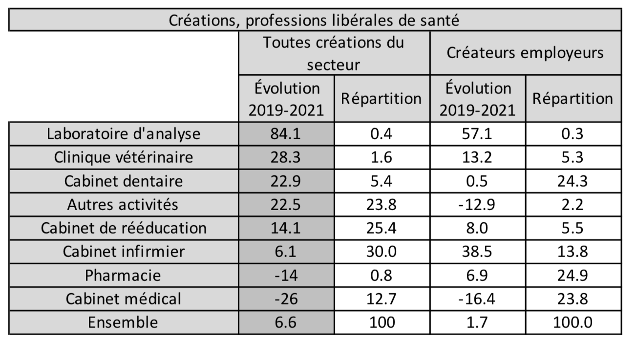 ♦ Dans le secteur de la santé en progression beaucoup plus modeste (+6,6 %), à l’exception des laboratoires d’analyse (+84 %), les autres activités progressent entre 6 et 22 % ; 2 activités voient leur volume de créations décroitre ; les pharmacies (‐14 %), les officines non‐employeuses devenant des exceptions, leur création relevant de reprises et les cabinets médicaux (-26 %) où la constitution de groupements employeurs aux dépens de l’exercice individuel sans salarié devient la norme.