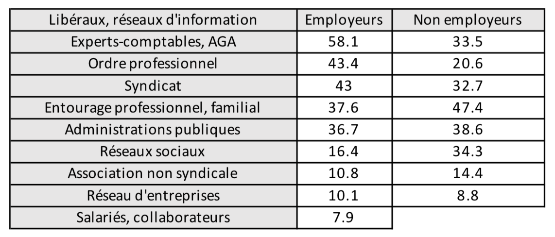 ♦ Du côté des employeurs, le recours à la sphère de relations personnelles directes est beaucoup moins prégnant (38 %), au profit des experts‐comptables et les associations de gestion agréées (58 %), puis des ordres professionnels (43 %) et syndicats (43 %), devant les administrations publiques (37 %) et loin derrière les réseaux sociaux (16 %), le réseau d’entreprises (10 %) et les salariés (8 %).