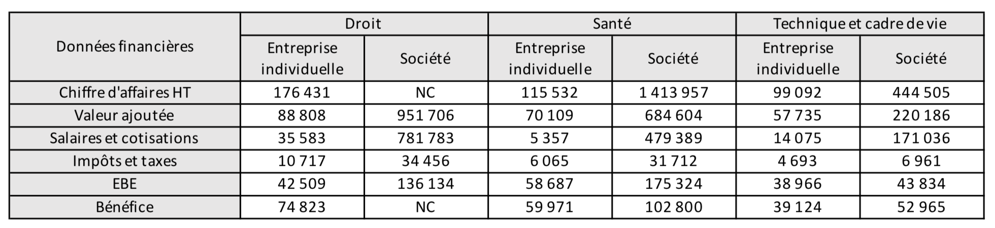 Les libéraux affichent 5 millions de clients. Leur chiffre d’affaires moyen HT est de 114 973€ (176 431 pour le droit, 115 532 pour la santé et 99 062 pour la technique et cadre de vie) avec une valeur ajoutée de 68 559€ par entreprise individuelle.
