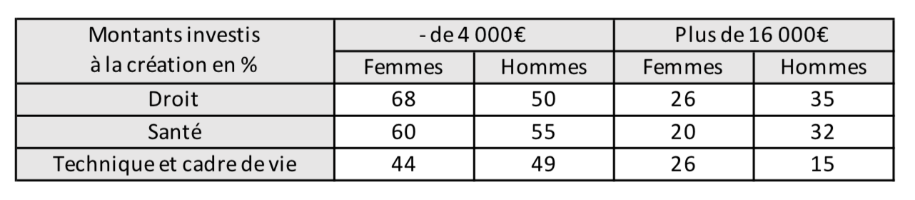Les femmes créatrices ont aussi plutôt moins investi que les hommes : moins de 4 000€ entre 60 et 68 % dans la santé et le droit vs 55 et 50 % pour les hommes. Celles qui ont investi plus de 16 000€ sont 26 % dans le droit (vs 35 les hommes), 20 % dans la santé (vs 32) et 26 % dans le technique et cadre de vie (15 % vs 15, pourquoi cet écart ?).