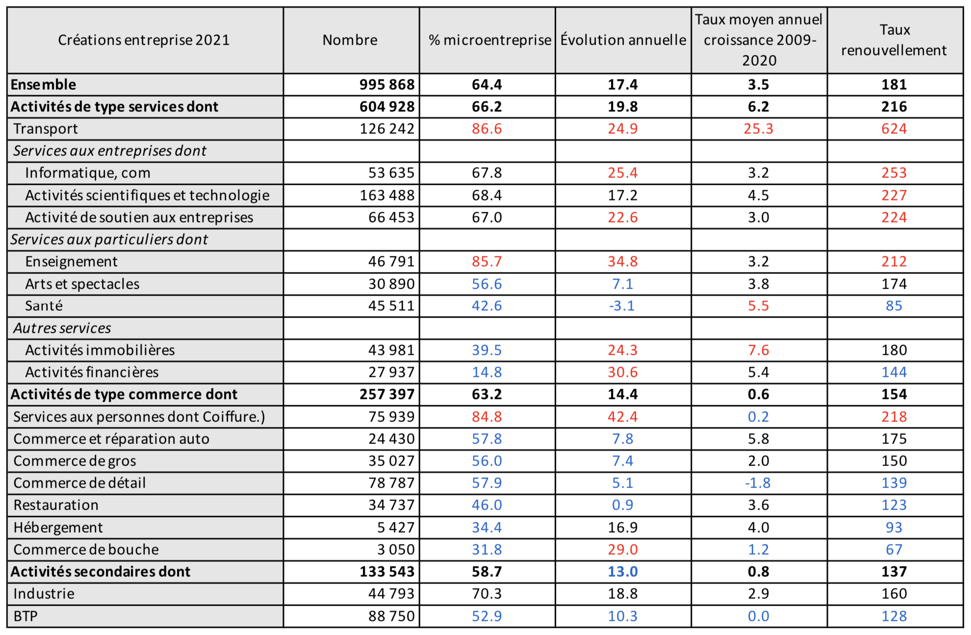 Les autres entreprises individuelles ont progressé de 1,7 %, alors qu’en croissance annuelle 2009-2020 elles régressaient de 2,5 % (extension du régime de la microentreprise).