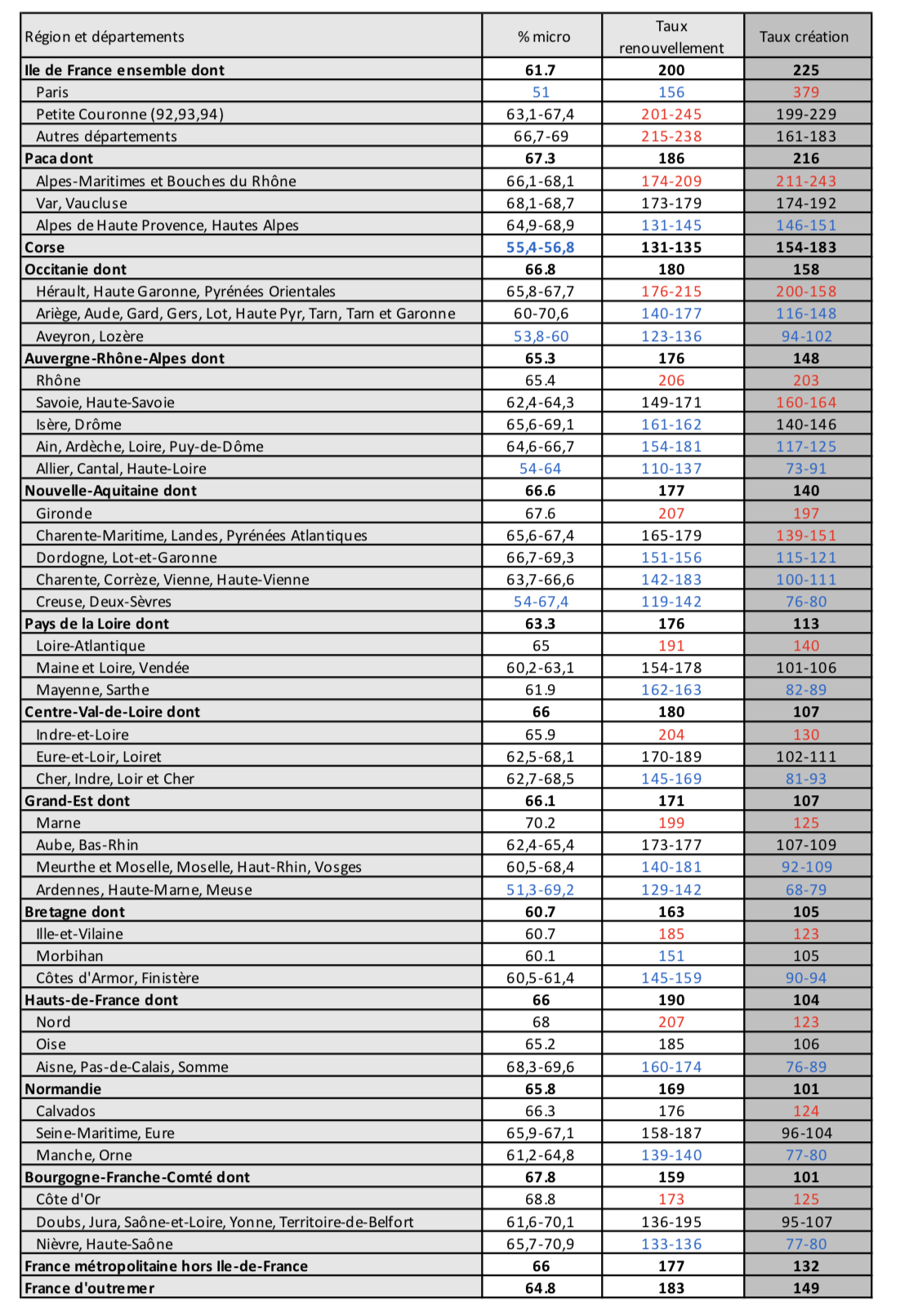 On retrouve clairement dans chaque région, la distinction métropoles ou grandes villes (taux élevés de renouvellement et de création) caractérisant les départements, et à l’opposé des taux nettement plus faibles pour les départements à dominante rurale.Noter que le poids des microentrepreneurs est assez proche dans la plupart des départements, sauf pour les plus ruraux où il est souvent plus faible.