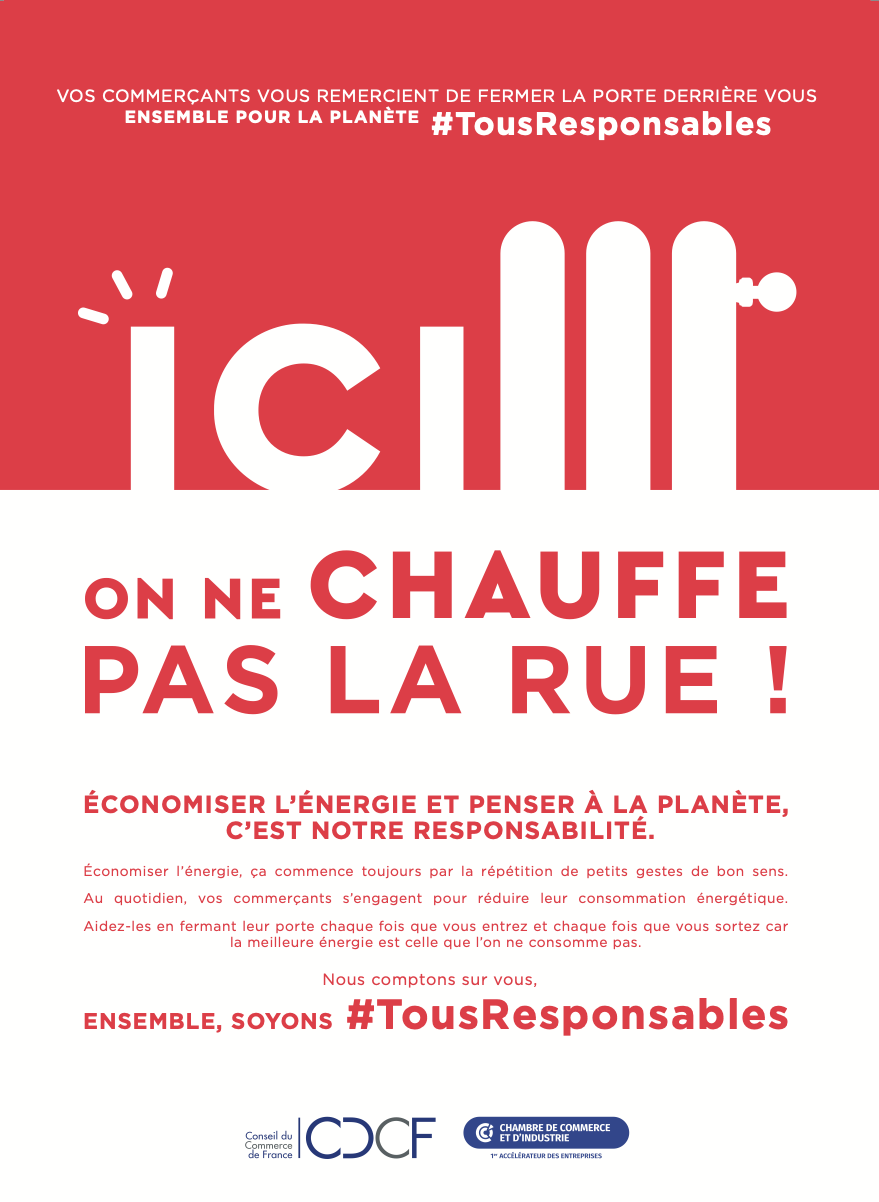 Cette campagne intitulée « Ici, on ne chauffe pas la rue ! » s’inscrit dans la lignée de la nouvelle interdiction pour les commerces et autres lieux commerciaux de laisser ouvertes les portes d’un local chauffé ou climatisé.